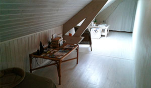 A l'étage, chambre mansardée, lit 160, console et porte-manteau, salle de bain, douche et WC.